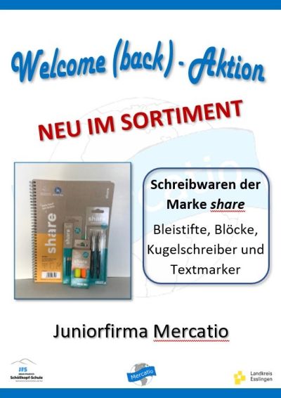 Zusätzlich gibt es einen Schülerrabatt von 15% und eine Welcome(back)- Aktion! In gewohnter Qualität bietet Mercatio ein vielfältiges Angebot: Schokolade, Gebäck, Tee & Kaffee sowie Pflege- und Hygieneprodukte. Neu im Sortiment ist auch eine kleine Auswahl an Schreibwaren!