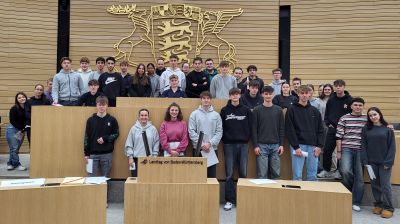 Die Schülerinnen und Schüler der Klassen WGJ1-B+D besuchten am 19.01.2024 den Landtag in Stuttgart. Die Anfahrt mit der S-Bahn aus Kirchheim verlief planmäßig. Von außen beeindruckte der Landtag durch seine Größe und Modernität. Doch auch die inneren Räumlichkeiten begeisterten die Klassen: Das Gedenkbuch mit den Abgeordneten, die zu NS-Opfern wurden, die unterschiedlich großen Stufen der Treppe, welche Politikern helfen sollen, Treppen im öffentlichen Raum ansehnlich, gelassen und unfallfrei zu besteigen, und der Plenarsaal hinterließen Eindruck, sowohl geschichtlich als auch politisch.